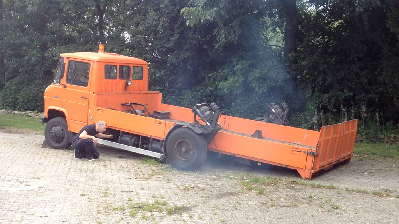 Our perfect vehicle! A small, vintage 7,5-ton truck, with a special feature: it can sit!
