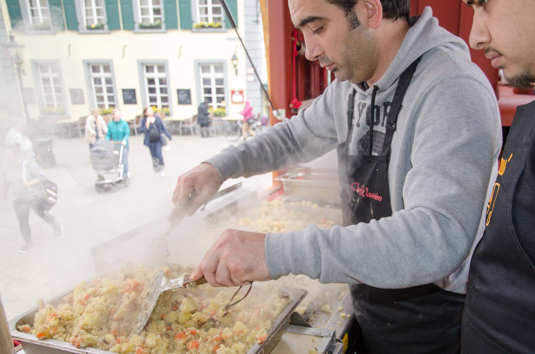 Until we arrived at the beautiful and well-located market square in Ratingen everything worked according to our plan and possible complications seemed to be far away. The location was already packed with a friendly crowd who couldn´t wait to see the kitchen live in action. What we didn´t plan for was the «spirit of unforeseen occurrences» which also tiptoed among the crowd. It introduced itself in form of a completely empty battery inside the container. What a nice introduction!